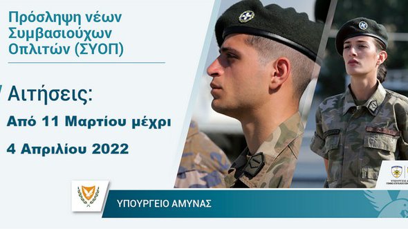 Το Υπουργείο Άμυνας ενδιαφέρεται να προσλάβει Οπλίτες με Σύμβαση στην Εθνική Φρουρά, για πλήρωση των κενών ή κενούμενων θέσεων από το σύνολο των θέσεων ΣΥ.ΟΠ. και προσκαλεί άτομα που διαθέτουν τα απαιτούμενα προσόντα, ως καθορίζονται στη σχετική προκήρυξη, να υποβάλουν αίτηση για πρόσληψη.