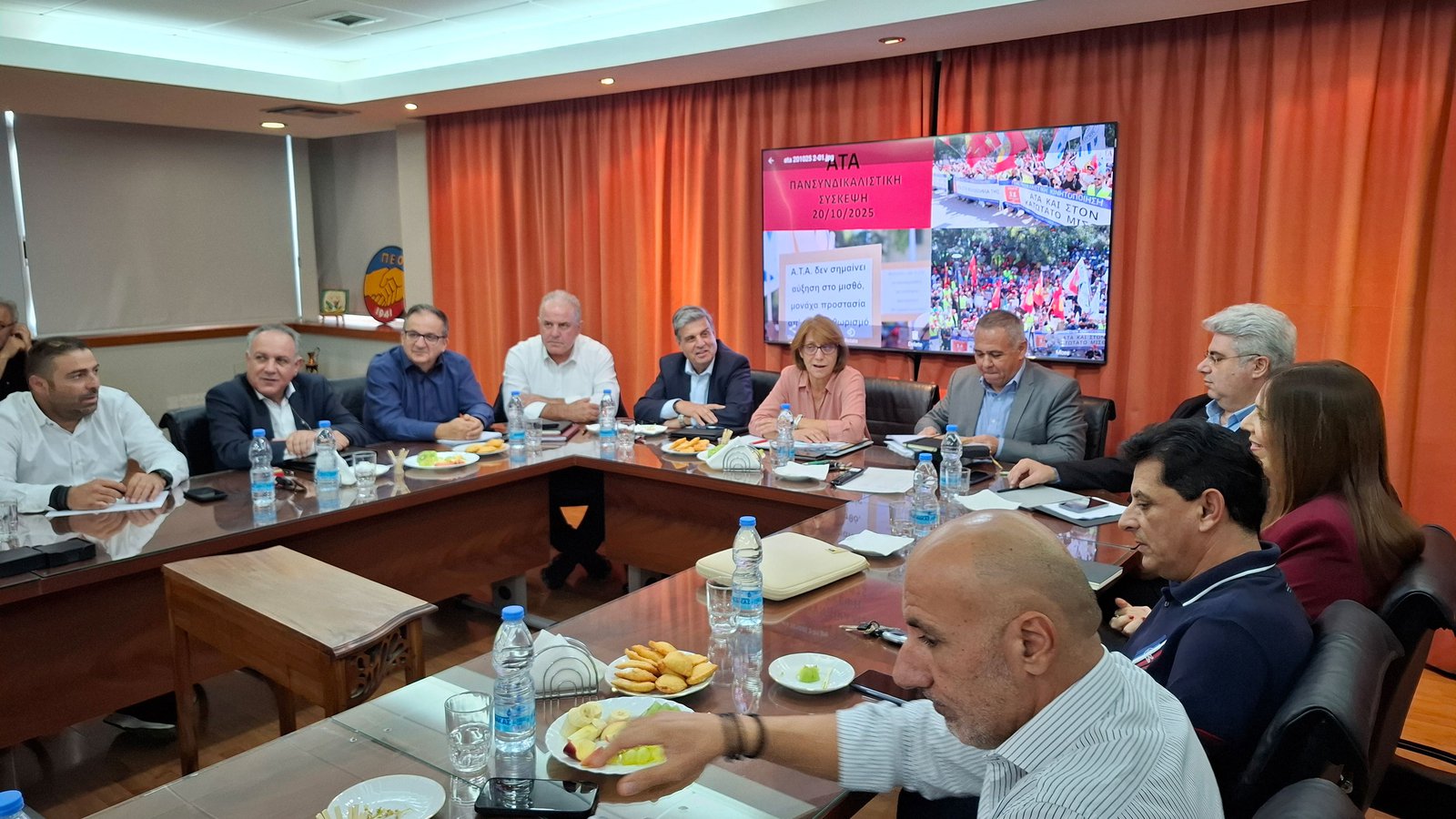 Η συνάντηση με τους επικεφαλής των συντεχνιών ΣΕΚ, ΠΕΟ, ΔΕΟΚ και ΠΑΣΥΔΥ πραγματοποιήθηκε παρουσία των υπουργών Οικονομικών και Εργασίας.