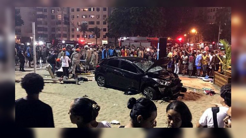Το μαύρο αυτοκίνητο βρίσκεται μέσα στην παραλία. Λίγο πριν είχε παρασύρει πεζούς που έκαναν τη βόλτα τους στην Κόπακαμπάνα, την φημισμένη παραλία του Ρίο ντε Τζανέιρο.