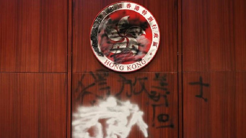 Οι διαδηλωτές που εισέβαλαν στο τοπικό κοινοβούλιο τη Δευτέρα άπλωσαν στην έδρα τη σημαία που χρησιμοποιούταν στο Χονγκ Κονγκ κατά την περίοδο που ήταν βρετανική αποικία.