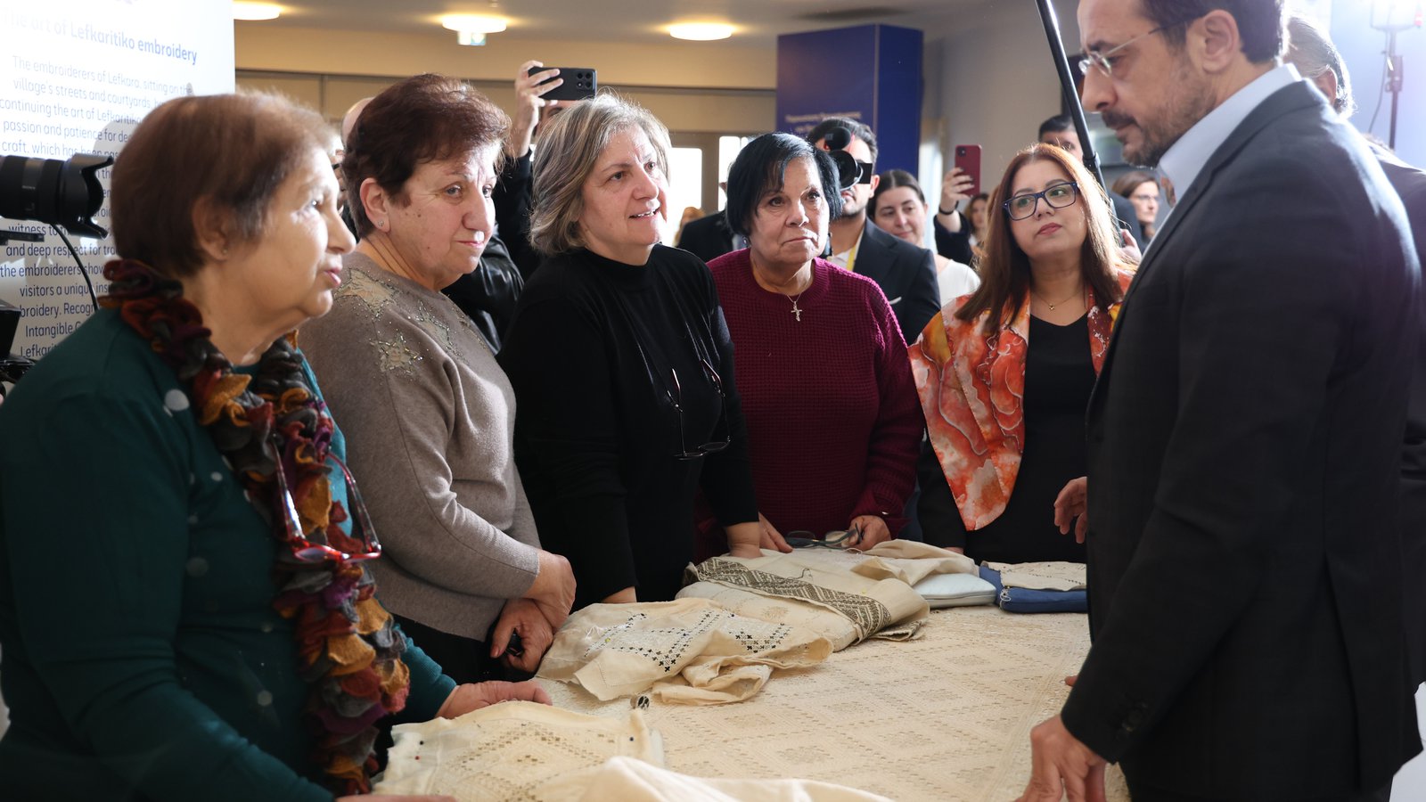 Εισερχόμενος στο Συνεδριακό Κέντρο Λευκάρων, ο Πρόεδρος Χριστοδουλίδης συνομίλησε με κεντήτριες που κεντούσαν το παραδοσιακό λευκαρίτικο κέντημα, από το οποίο άντλησε έμπνευση το λογότυπο της Κυπριακής Προεδρίας.